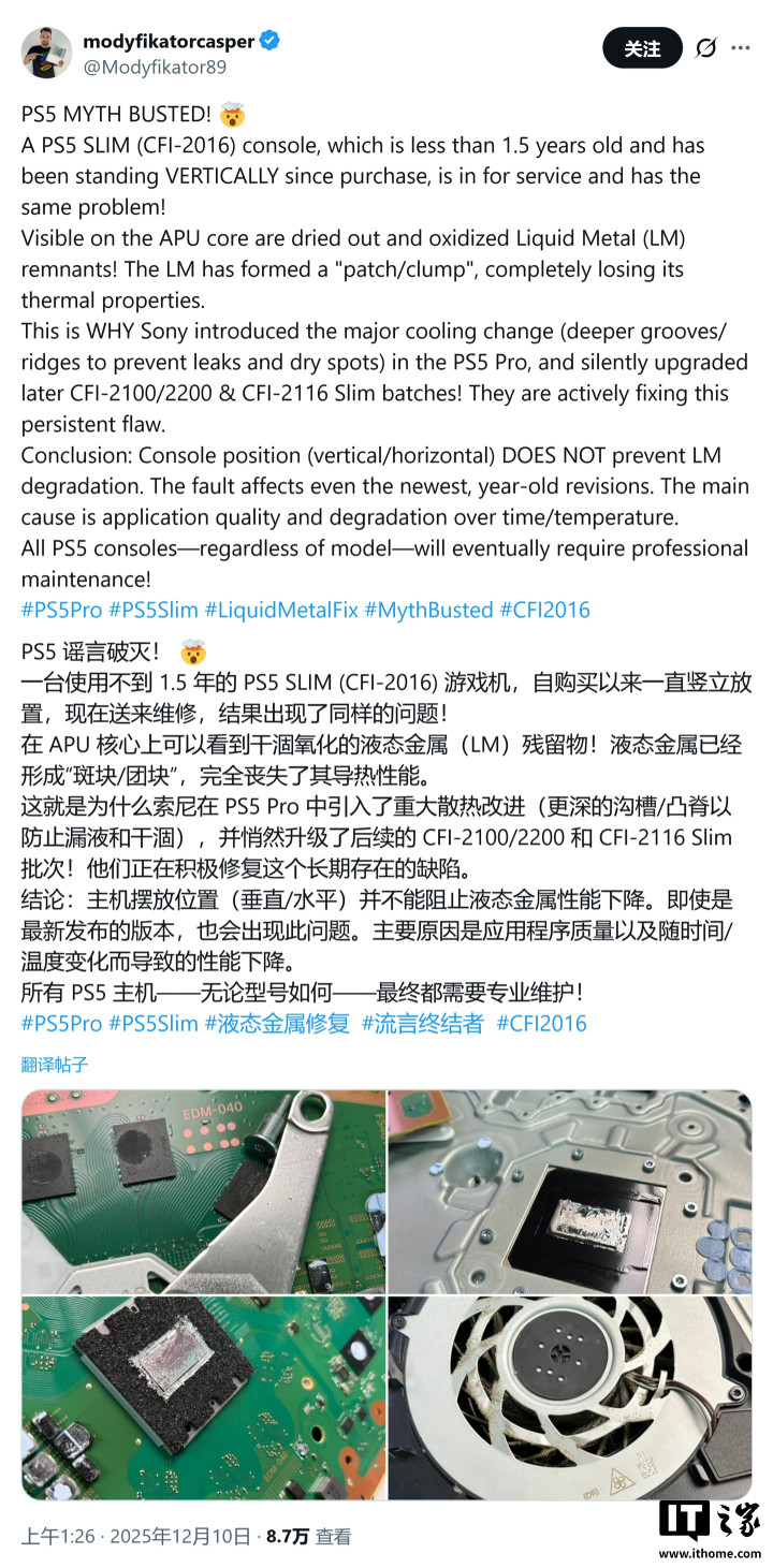 IT之家12月11日消息,维修技师modyfikatorcasper昨日(12月10日)在X平台发布推文,警告称由于液态金属的涂抹质量以及随时间推移产生的物理降解,所有PlayStation5游戏主机最终都将无法避免地需要开机维护。